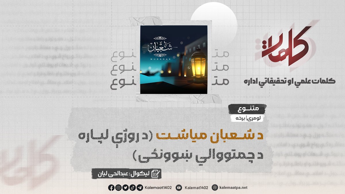 د انسان په ایماني ژوند کې الله تعالی ځانګړي وختونه او فرصتونه ایښي دي چې هر یو یې د روحي ودې او د هغه د نږدوالي په لار کې د بدلون ټکی کېدای شي. دا برکت ناک وختونه ځانګړې موقع برابروي چې انسان په خپل ځان بیا غور وکړي، زړه پاک کړي او پخوانۍ نیمګړتیاوې جبران کړي. په دغو پړاوونو کې د الهي رحمت دروازې لا ډېرې پرانېستل کېږي، د بېرته ستنېدو او اصلاح زمینه لا پراخېږي او د معنوي راتلونکي د جوړولو امکان تر بل هر وخت ډېر برابرېږي. له دغو مهمو فرصتونو څخه یو چې له ډېر لوړ عظمت سره سره لږ پام ورته کېږي د شعبان میاشت ده؛ هغه میاشت چې رسول الله صلی الله عليه وسلم د ډېرو خلکو د غفلت میاشت بللې ده.